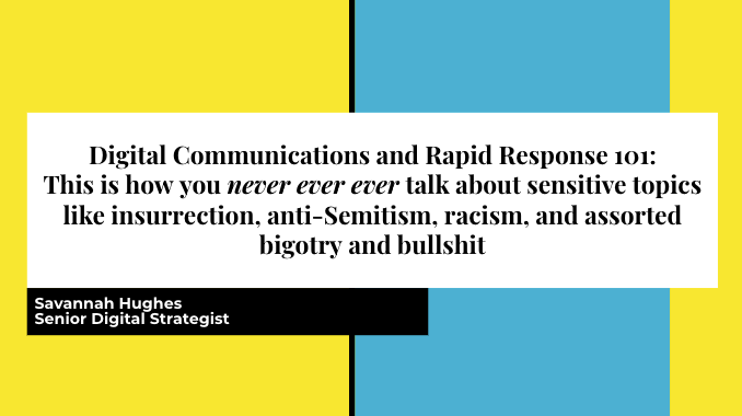 I’ve had to deal with a lot of tricky situations in my job. As a Democratic digital strategist, I am the person my client looks to and asks, “What should we say about this online?” Forever on my toes, I figure it out and deliver the agreed-upon message and call to action to thousands of Democrats, activists, and community-organizers online. And in the past few years, I’ve had to grapple with wildfires, school shootings, police lynchings, government shutdowns, a rapist and a moron being elected to the Supreme Court, kids in cages, and End of Quarter Federal Election Commission deadlines. (Some of these are admittedly more painful than others.)